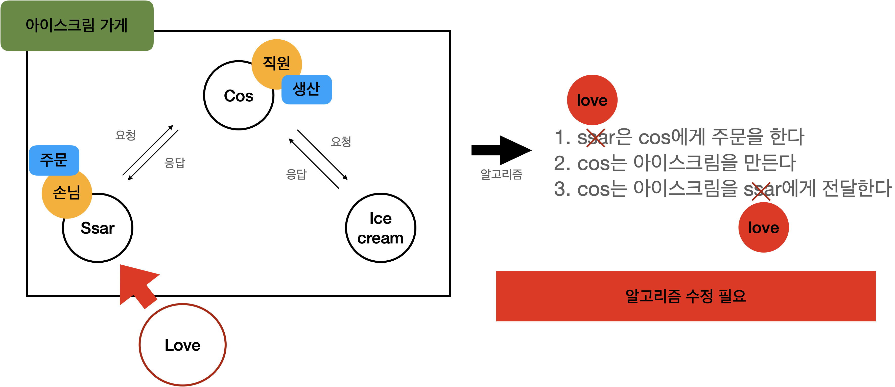 손님과 직원의 개념을 추상화 시키면서 ssar, love에게 손님의 추상화 된 개념을 주입하고, cos에게 직원의 추상화 된 개념을 주입함을 통해 알고리즘의 수정을 막고 재사용성을 증대 시킵니다.
