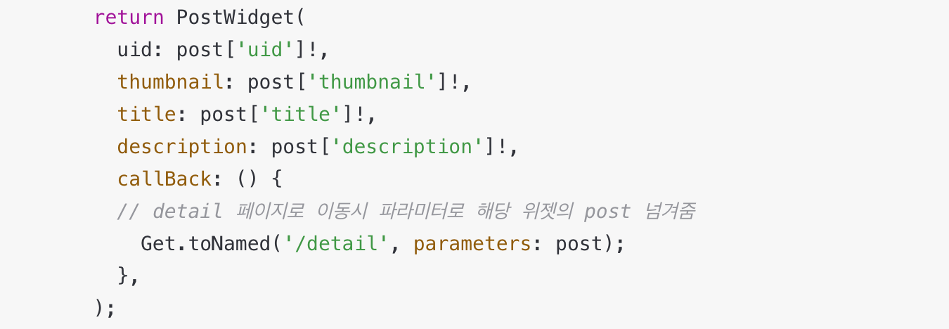 // detail 페이지로 이동시 파라미터로 해당 위젯의 post 넘겨줌