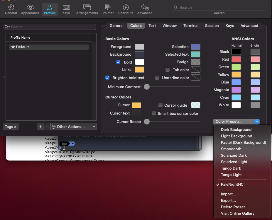 iTerm2-Color-Schemes 이 곳에서 스크린샷을 보며 선택 가능