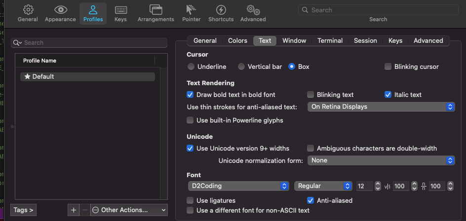 iTerm 테마 설정 해준 것처럼 preferences -> profiles -> text 에서 설정