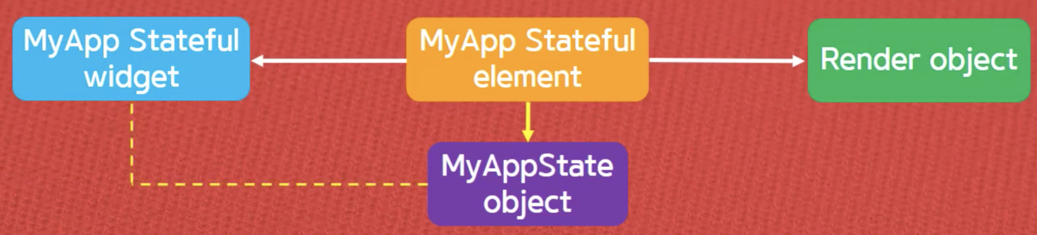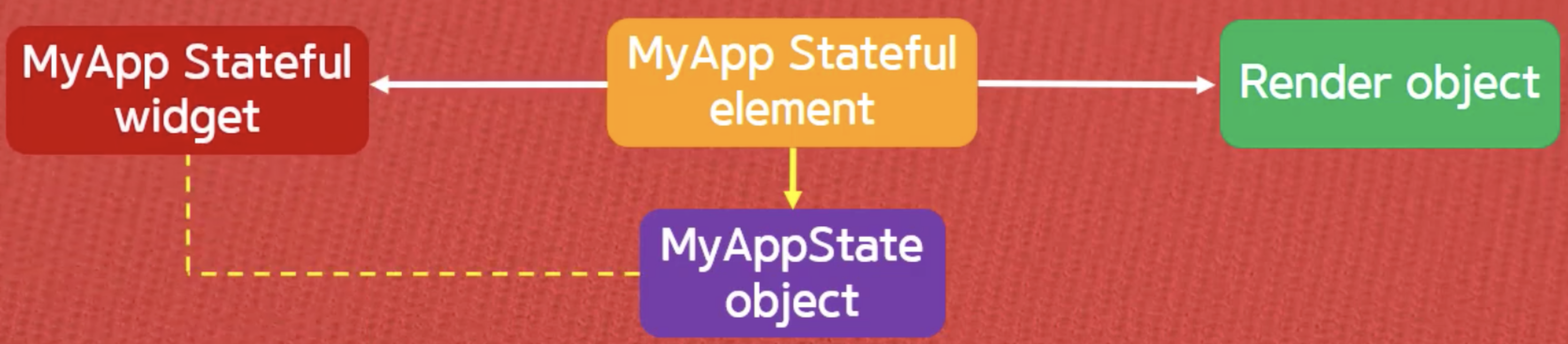 여기서 특이점은 MyApp Stateful element는 위젯 관련 중요 정보들을 가지고 있지만, 메모리 상에서 어디에도 종속되지 않는 독립된 객체로서 MyAppState 객체에 대한 정보도 가지게 되는 것입니다.