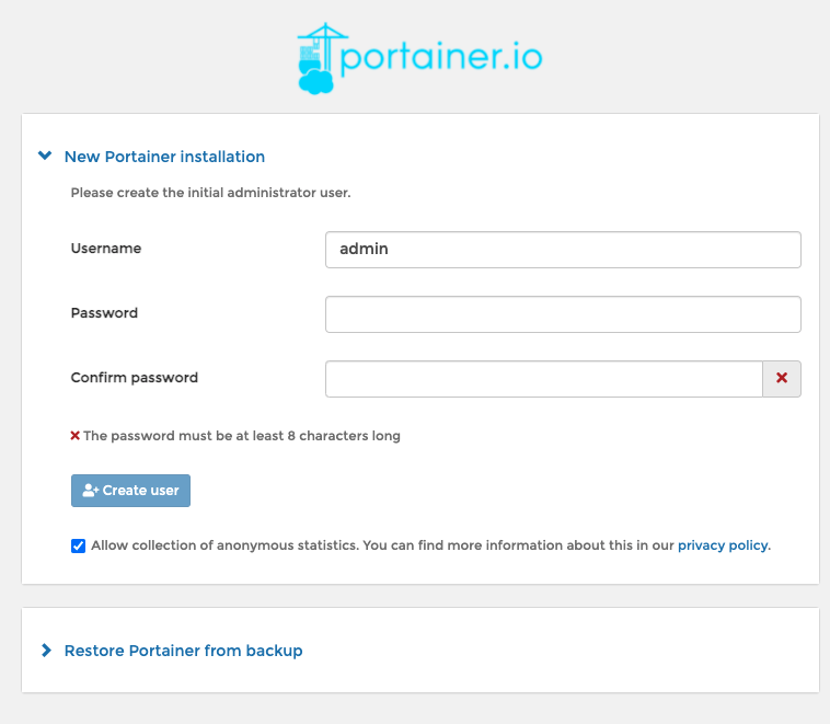 docker run -d -p 9000:9000 --name=portainer --restart=always -v /var/run/docker.sock:/var/run/docker.sock -v portainer\_data:/data portainer/portainer-ceportainer 접속